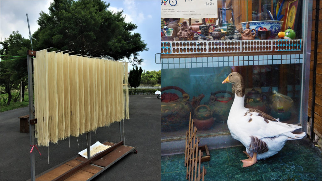 朗朗晴天適合曬麵線,百年來的奠機能擁有昂首神氣的鵝。左為玫來晏趣麵線,右則是彰春茶庄。