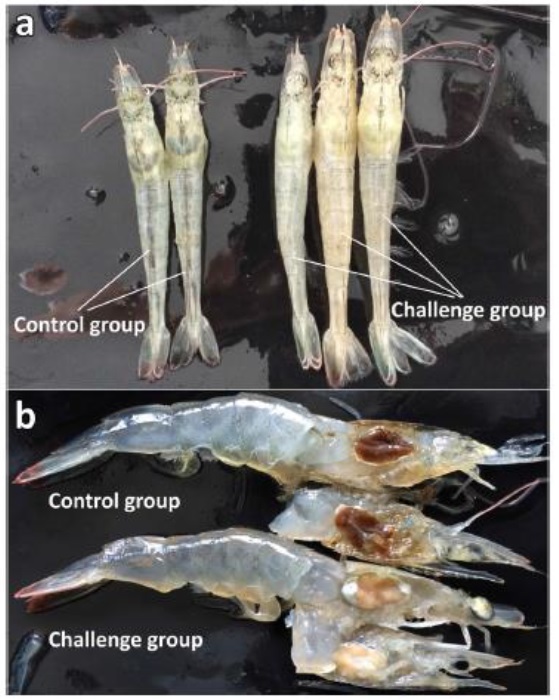 白蝦是國內主要養殖蝦類,使得這個病毒更令人關注。畜衛所指出,感染十足目虹彩病毒的白蝦,肉眼即可辨視病變,罹病白蝦呈現軟殼、肝胰腺變黃白色、胃及腸道無內容物;罹病泰國蝦在頭部額角基部甲殼下出現三角形白色斑塊;肝胰腺萎縮,顏色變淡黃色。