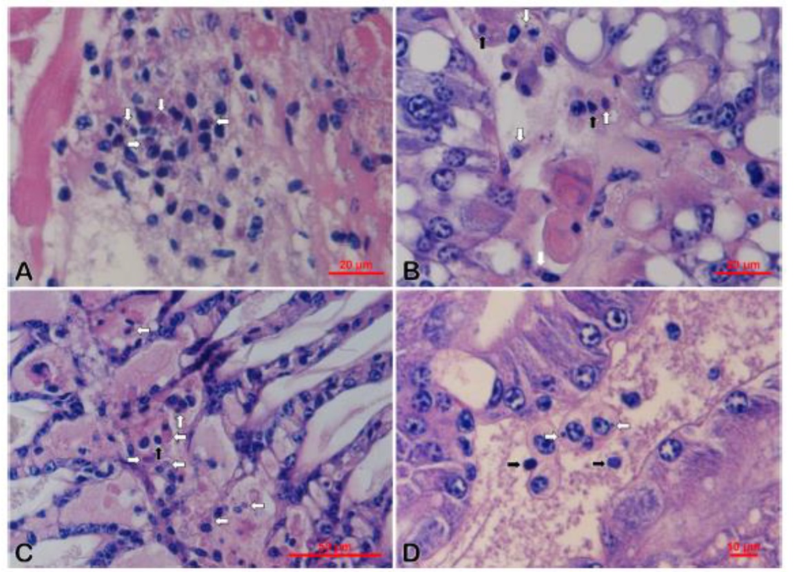 自然感染十足目虹彩病毒的泰國蝦組織病理變化,A-C圖為泰國蝦,D圖為日本沼蝦。A圖為造血器官,B及D圖為肝胰腺,C圖為鰓。白色箭頭為嗜鹼性包涵體,黑色箭頭為核 濃縮。(圖片來 源 /畜衛所)
