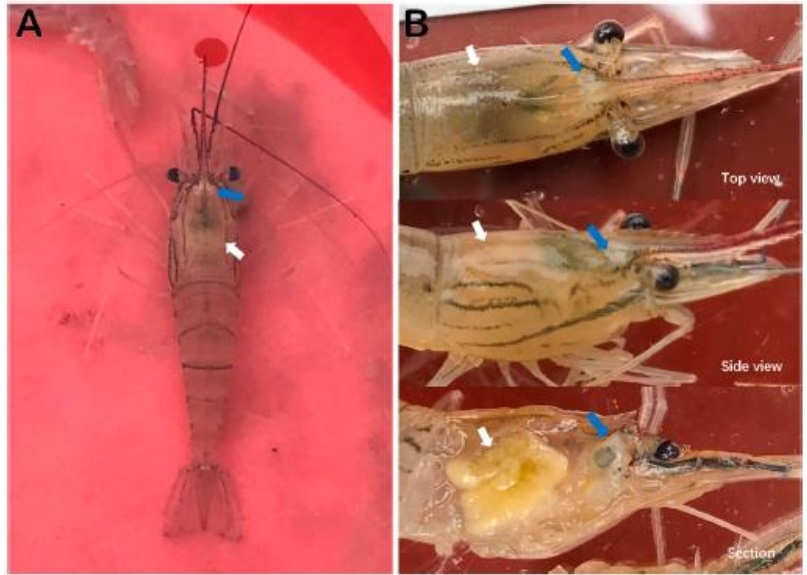自然感染十足目虹彩病毒的泰國蝦臨床症狀,A圖可見額角基部出現白色斑塊(藍色箭頭)、肝胰腺萎縮,顏色變淡黃色(白色箭頭);B圖為放大圖片。(圖片來源/畜衛所)