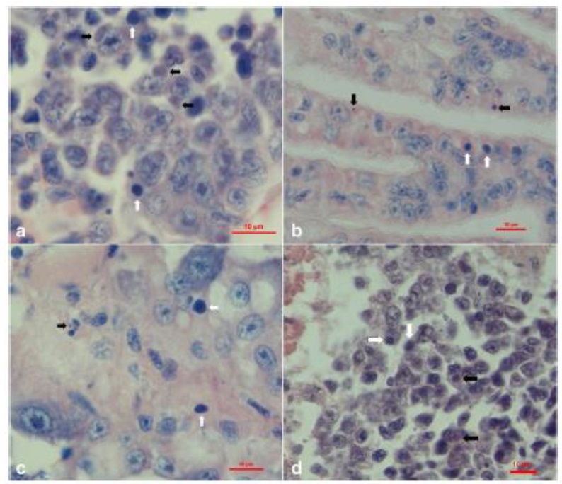 自然感染十足目虹彩病毒的白蝦之組織病理變化。A圖造血器官、B圖為鰓、C圖為肝胰腺、D圖為步足。黑色箭頭為嗜鹼性包涵體、白色箭頭為核濃縮。(圖片來源/畜衛所)