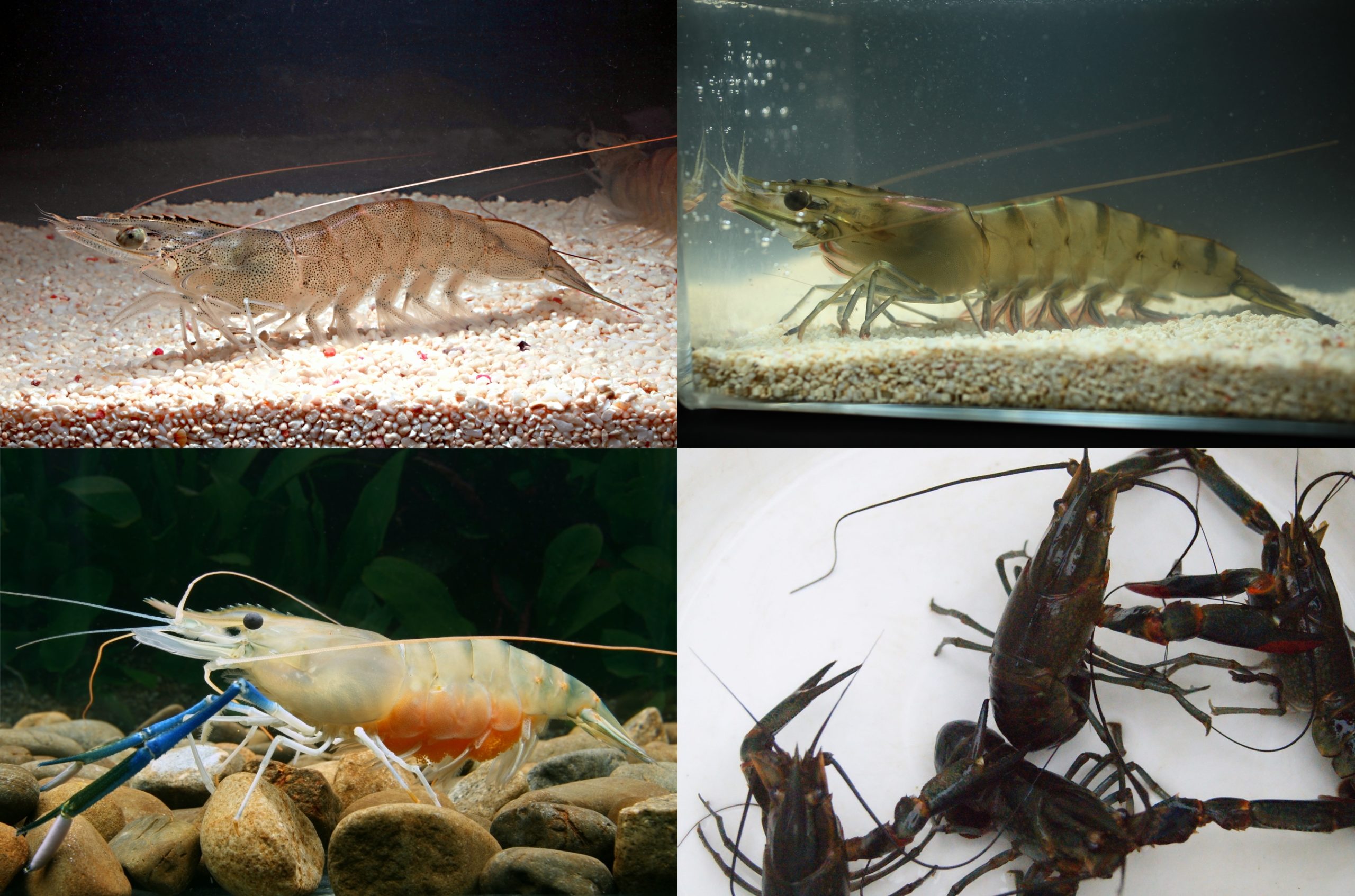 左上起順時針方向依序為:白蝦、草蝦、泰國蝦、四脊骨螯蝦的健康狀態。(圖片提供/農委會)