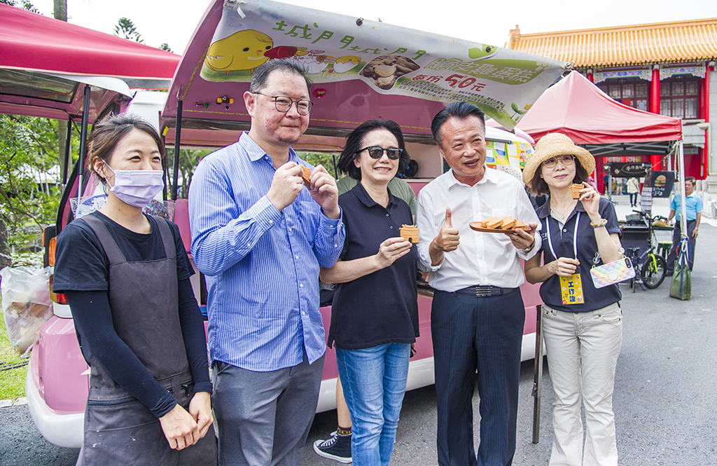 翁章梁縣長和來自嘉義的農產品攤商,向民眾介紹產自嘉義的農特產品,大小朋友一起品嚐,翁章梁縣長擔任嘉義農特產品行銷大使,大力推廣嘉義的優質農特產品。