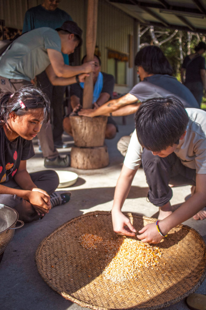 眾人合力分工舂打、整理玉米碎粒。