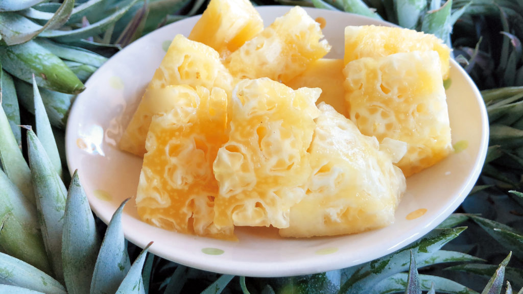 切開後細細看,其實每款鳳梨的紋路與色澤都不相同。這是民雄「阿美鳳梨」種植的特有品種「玉蘭花鳳梨」,果肉有著如花般的紋路,氣味高雅清新。