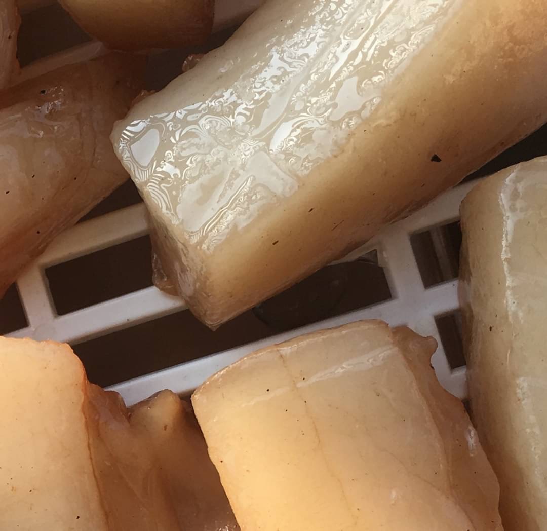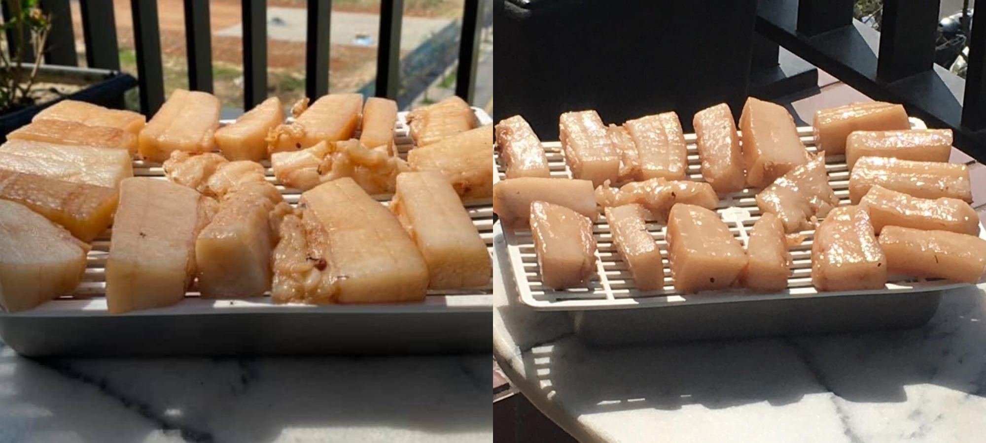 剛開始日曬和正在出油的豬背油。