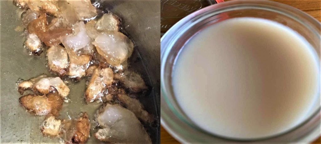 完成的豬背油熬製成液態豬油備用。