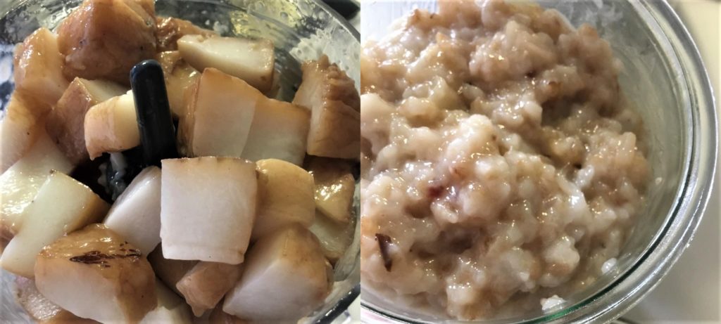 完成的豬背油放入食物調理機打成碎丁,可製成麵包塗醬或放在pizza的麵皮上,烤出迷人的香氣。