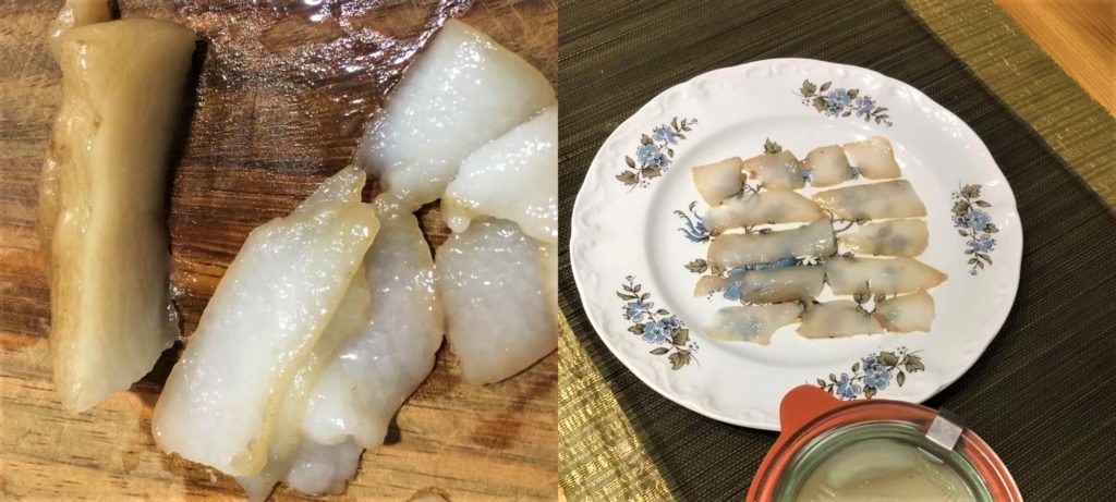 完成後的臘豬油切薄片狀,應呈現晶亮如白玉般的白色油脂。
