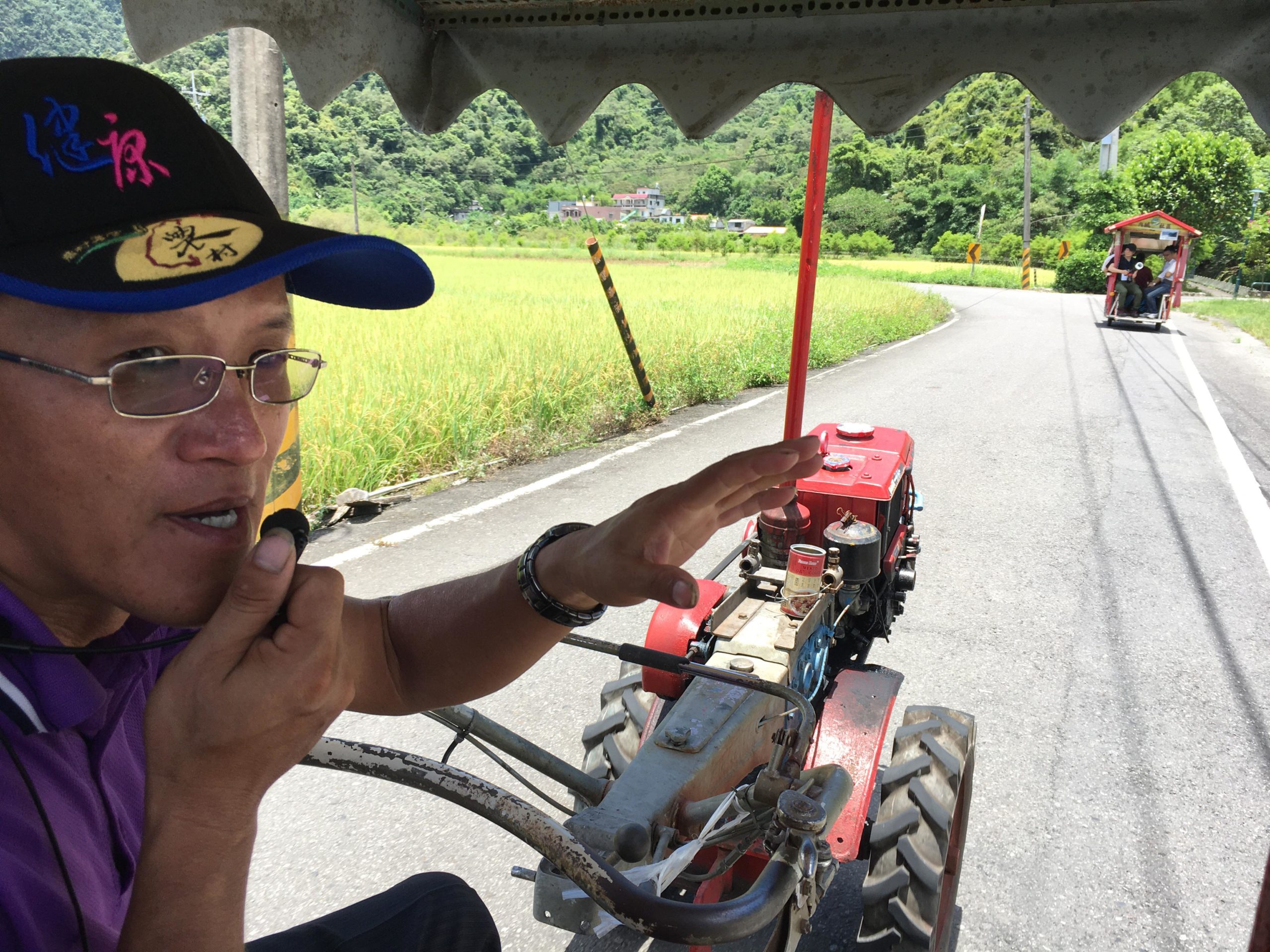 內城社區發展協會總幹事簡裕鴻擔任「鐵牛力阿卡」駕駛,並為遊客導覽社區風光。(攝影/游昇俯)