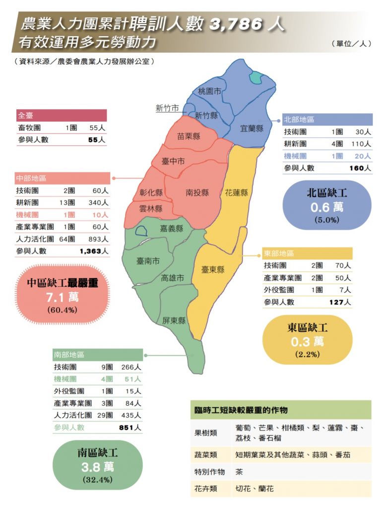 為舒緩農業缺工問題,農委會於2016年建置「農業人力資源平臺」(https://ahr.coa.gov.tw)媒合勞動力的供需,2017年成立農業人力團,隔年成立機械代耕團並設置「農業機械耕作服務系統」,同時引進外籍移工,以補充農村勞動力。