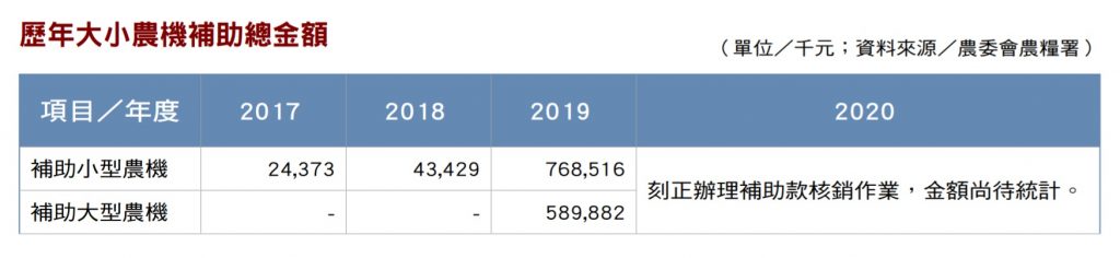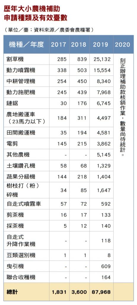 除了提供農機補助,農委會每年也投入2億元以上研發經費,盤點國內須優先開發之重點農機具,由農業試驗改良場(所)與大專院校合作研發、改裝適宜國內使用的農機,並合作開辦教育訓練,提升農民使用農機的技能及操作的安全性。此外,提供低利貸款,降低農民購置機械的負擔。