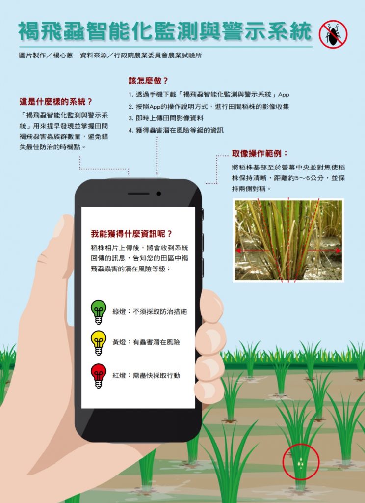 目前褐飛蝨蟲害防治最有效的方式是適時且合理適量使用合法的推薦農藥。藥劑噴灑時機在臺灣有兩種依據,一是農民自身的種植防治經驗,二是國內警示系統發布。農民依賴前人或過往經驗,容易發生浪費及防治效益不彰,進而發生藥劑殘留的食安問題;而警示系統的發布又面臨專家或專職人員日漸稀少,經驗無法傳承,導致族群密度掌握誤差偏大,以及能夠提供的即時資訊量非常有限。氣候暖化之下,面對褐飛蝨繁殖加速、發生時期及頻度加劇的情境,防治策略的擬定與決斷都必須簡易快速,才能超前布署,因應從容。 「褐飛蝨智能化監測與警示系統」就是因應上述面臨問題而研發的系統,希望建置一個系統,讓農民與農業專家能夠共同參與使用。農民使用此系統,可以輕鬆監測田區的褐飛蝨數量密度,作為決斷是否進行防治的依據;農業專家可以透過本系統,彙整各地褐飛蝨族群密度資訊,進行全國褐飛蝨流行分布趨勢分析,提供農政單位適時發布預警與防治。
