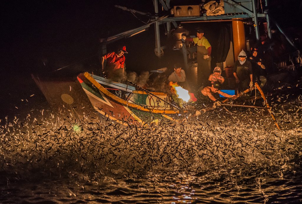 氣溫漸升的初夏,海面上漁火,時而銀白耀眼,時而轉為透著神祕氛圍的青綠色,只見船隻在離岸不遠處來回作業。這些以燈火誘集海中生物進而作業的漁船,大多以初夏的魩鱙、青鱗仔或苦蚵仔等小型漁獲為主,隨著水溫漸升,以基隆為中心,往金山萬里方向的北海,或是向著宜蘭方向的東北角海域,則是白帶魚或是小卷的作業漁場。