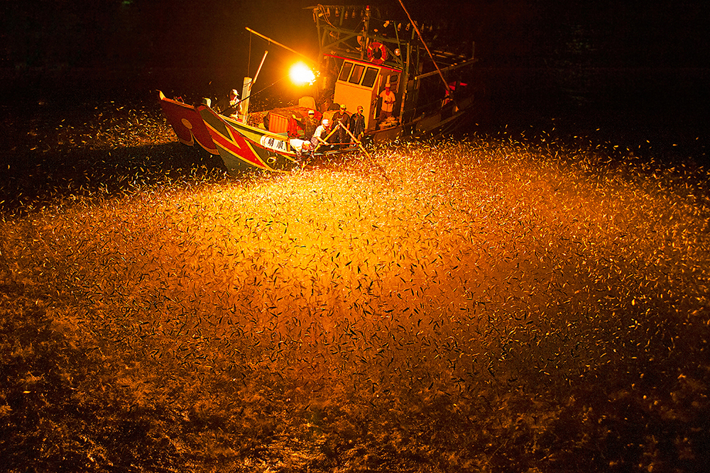 氣溫漸升的初夏,海面上漁火,時而銀白耀眼,時而轉為透著神祕氛圍的青綠色,只見船隻在離岸不遠處來回作業。這些以燈火誘集海中生物進而作業的漁船,大多以初夏的魩鱙、青鱗仔或苦蚵仔等小型漁獲為主,隨著水溫漸升,以基隆為中心,往金山萬里方向的北海,或是向著宜蘭方向的東北角海域,則是白帶魚或是小卷的作業漁場。