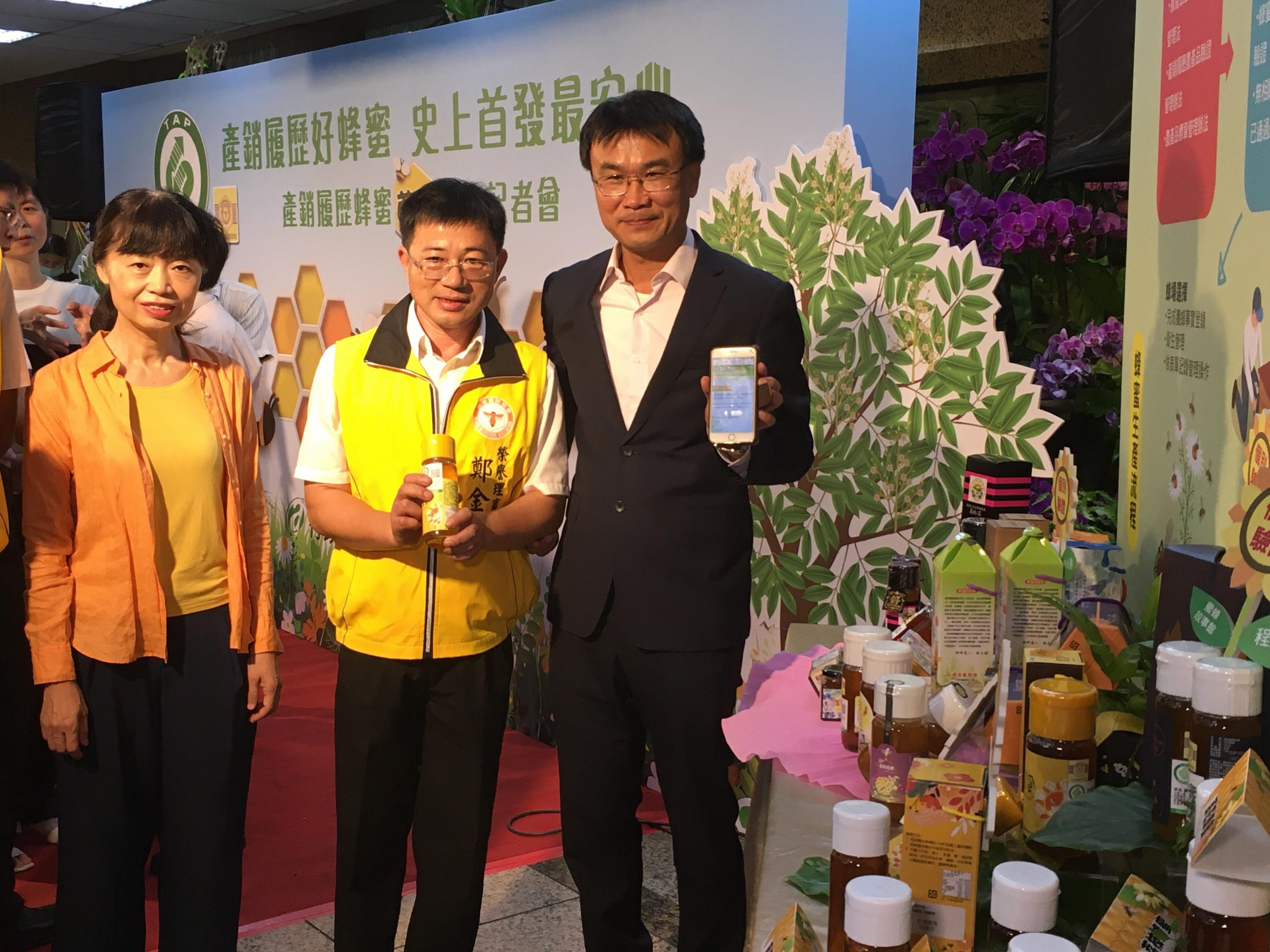 農委會主委陳吉仲(右1)現場用手機掃描蜂農鄭金崑(右2)產品QR Code,確認可查詢相關驗證、生產紀錄。(攝影/游昇俯)