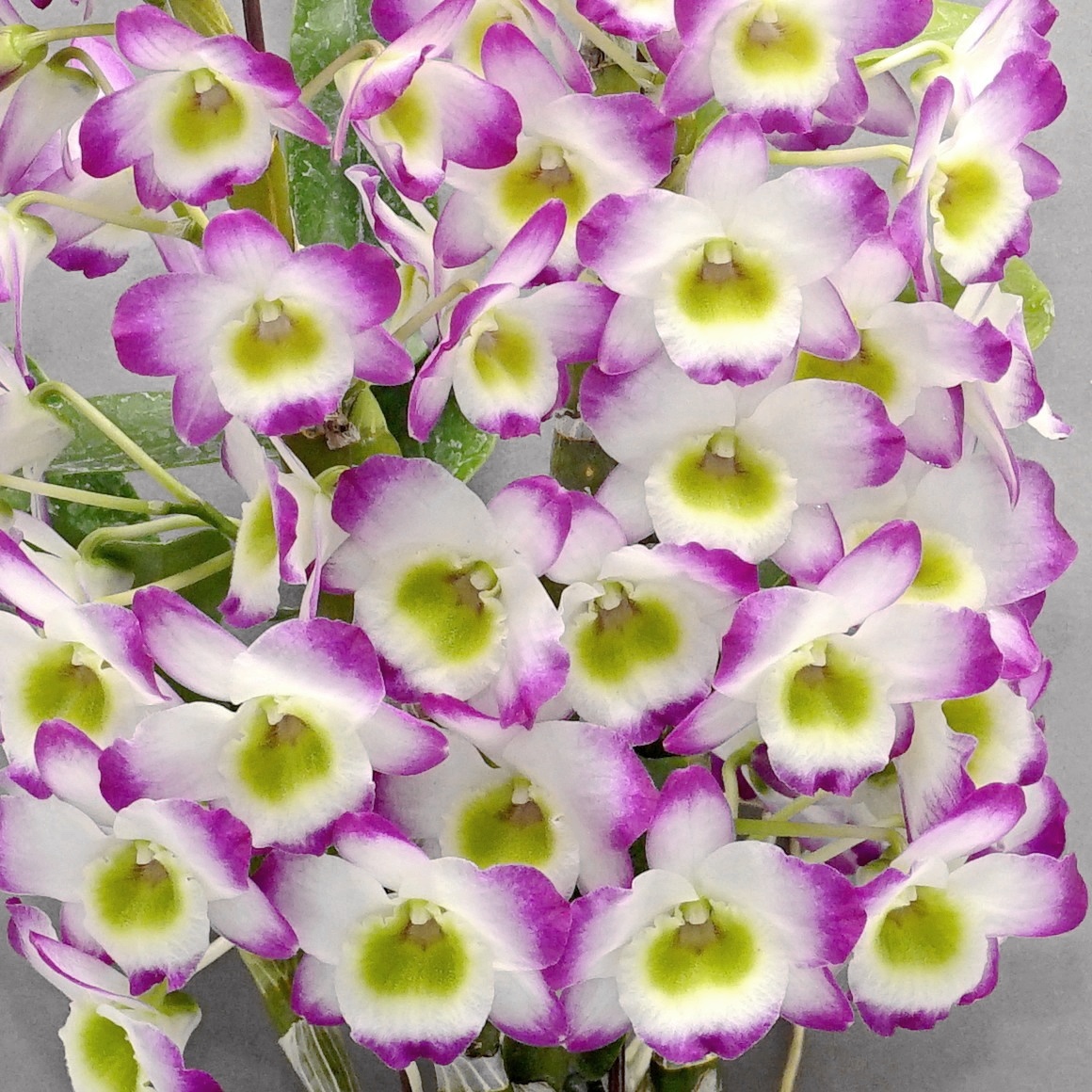 春石斛「台中4號─芳明翡翠」擁有帶綠眼、白花紫紅邊覆輪花色。(圖片提供/臺中區農業改良場)