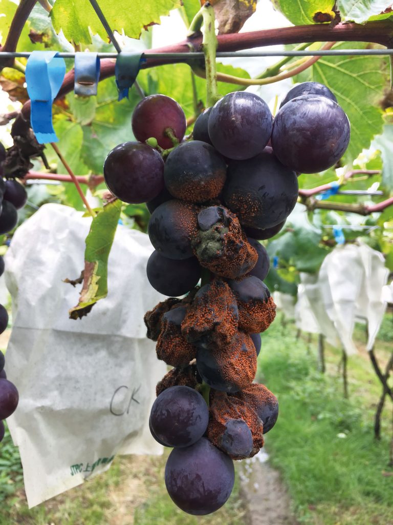 另外,晚腐病具有潛伏感染的特性,也就是說,病原菌在葡萄果實尚未轉色時侵入後不會立即產生病徵,要等到果體進入轉色期,病原菌才會開始擴展、造成果腐的情況。也因此,農民往往錯失最佳防治時機,在錯誤時機過度使用藥劑,導致農藥殘留超標的問題。