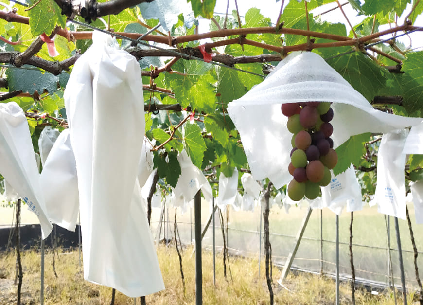 圖左為本場建議的套袋方式,圖右則是農民普遍使用的套果傘方式。