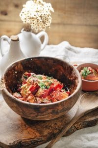 4.取出浸漬的蔬菜混拌北非小米、切丁洋蔥與番茄,撒上切碎的巴西里或香菜,依喜好淋上南瓜籽油或蜂蜜調味